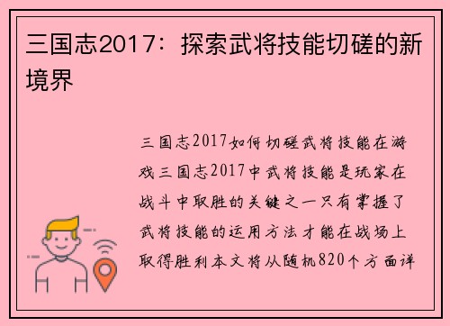 阅读PSV三国志13如何操作 引言: PSV三国志13是一款非常经典的策略游戏,玩家扮演一位三国时期的领导者,通过政治、外交、战争等手段来统一中国。本文将从随机的8个方面详细阐述如何操作这款游戏,帮助玩家...